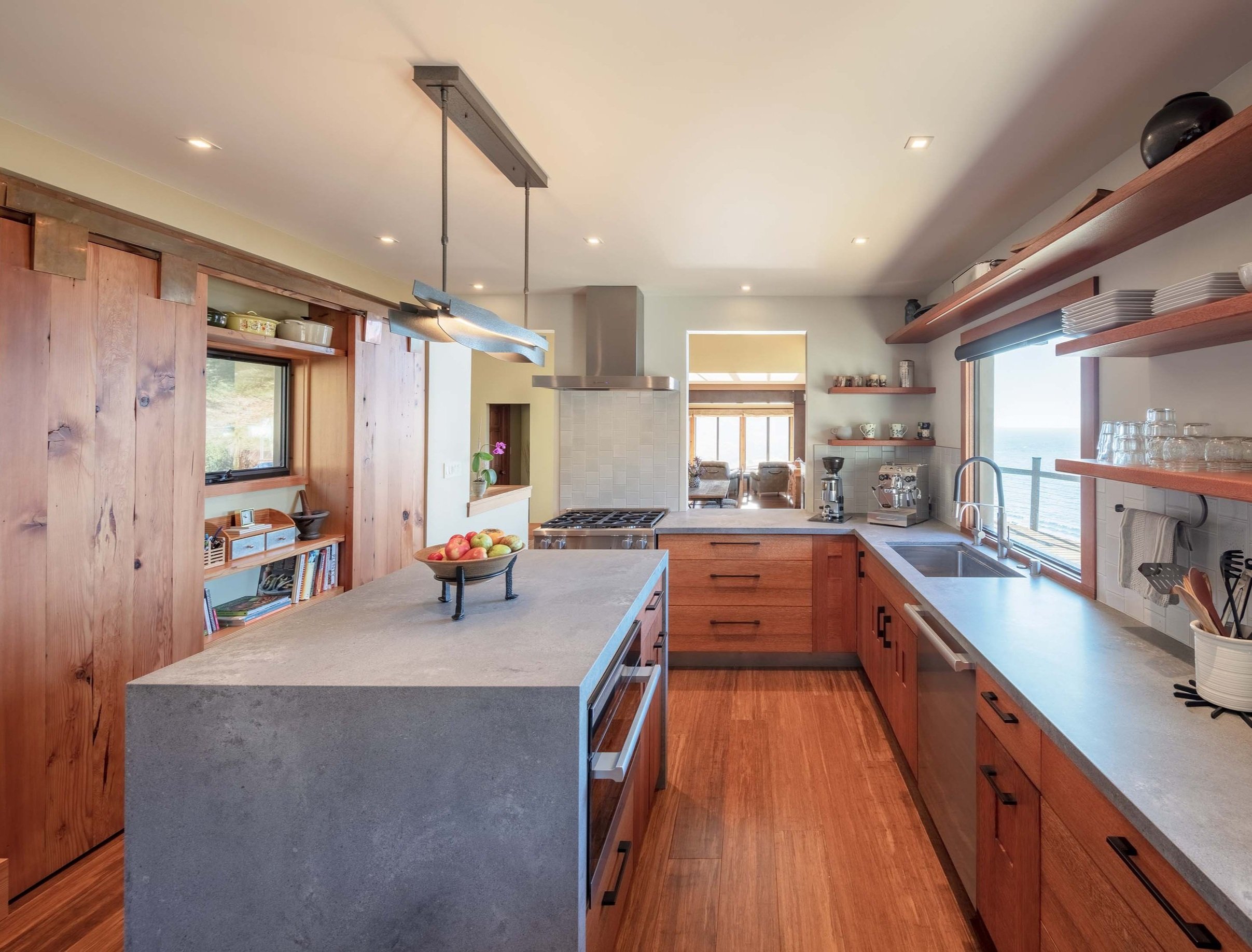 Perched along the Muir Beach bluffs, this remodel involved expanding the kitchen to create an open layout and reveal the extraordinary view to the ocean. This modification made room for an island and eating area, optimizing function as well as creating a central gathering place in the home. New access from the kitchen to the existing deck provided an ideal connection to the outdoors for entertaining. Much attention was given to materials that spoke to its natural surroundings and the home’s artistic/eclectic style. Mixing tactile elements from wood, concrete, metals, and hand-made tile offered a modern yet organic and sophisticated feel to the space.